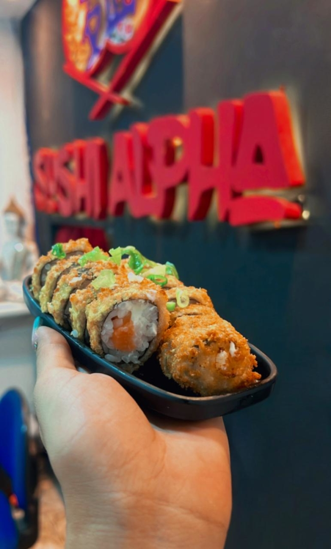 Alga, arroz, salmão, cream cheese e cebolinha, empanado na farinha panko e frito.