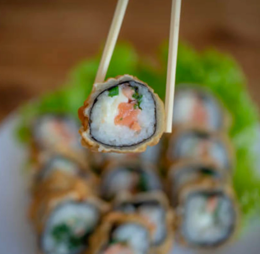 Alga, arroz, salmão, cream cheese e cebolinha, empanado na farinha panko e frito.