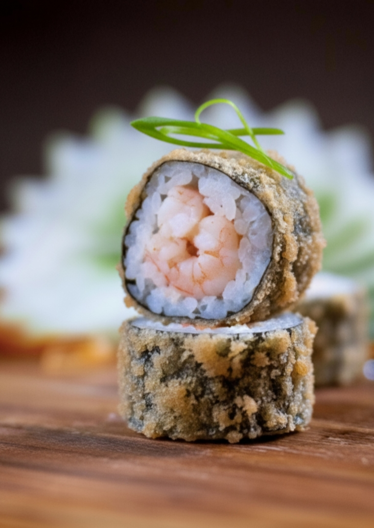 Alga, arroz, camarão, cream cheese e cebolinha, empanado na farinha panko e frito.