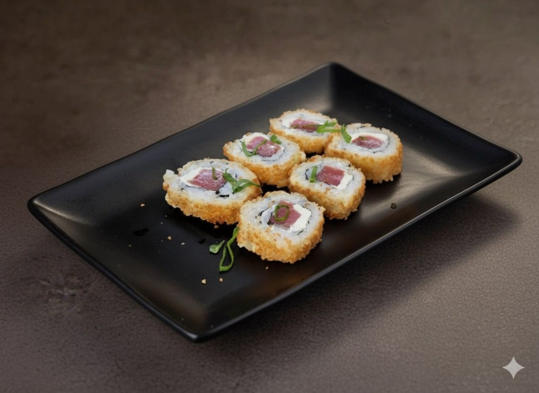 Alga, arroz, atum, cream cheese e cebolinha, empanado na farinha panko e frito.