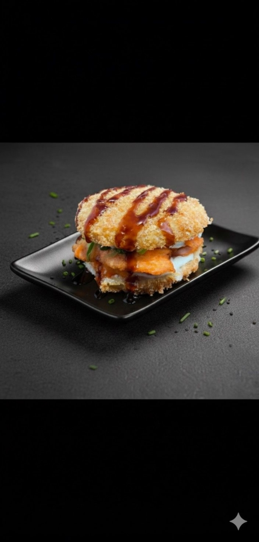 Saboroso sushi burguer, com arroz em forma de pão empanado e frito, com recheio de salmão, camarão empanado, cream cheese com chia e cebolinha.
