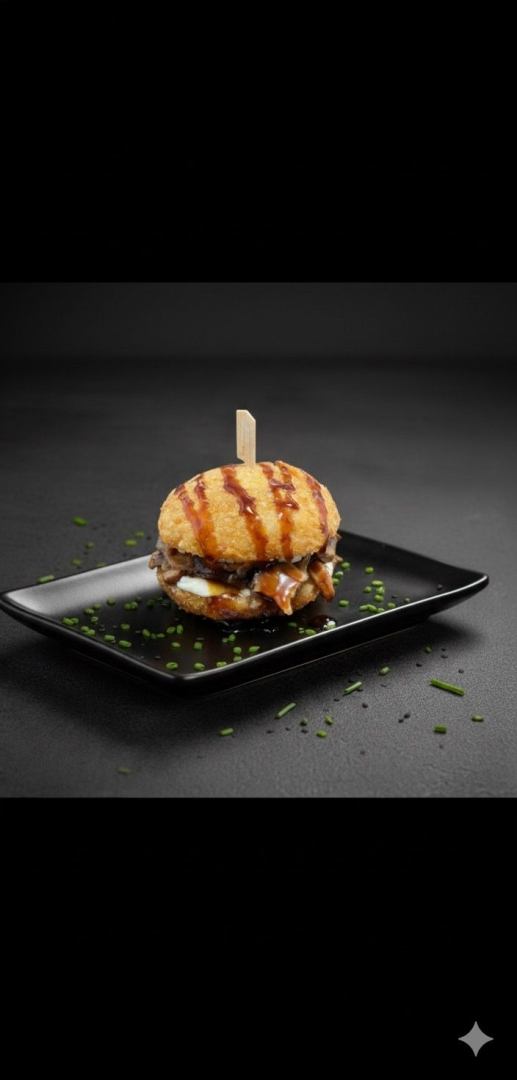 Saboroso sushi burguer, com arroz em forma de pão empanado e frito, com recheio de salmão, camarão empanado, cream cheese com chia e cebolinha.