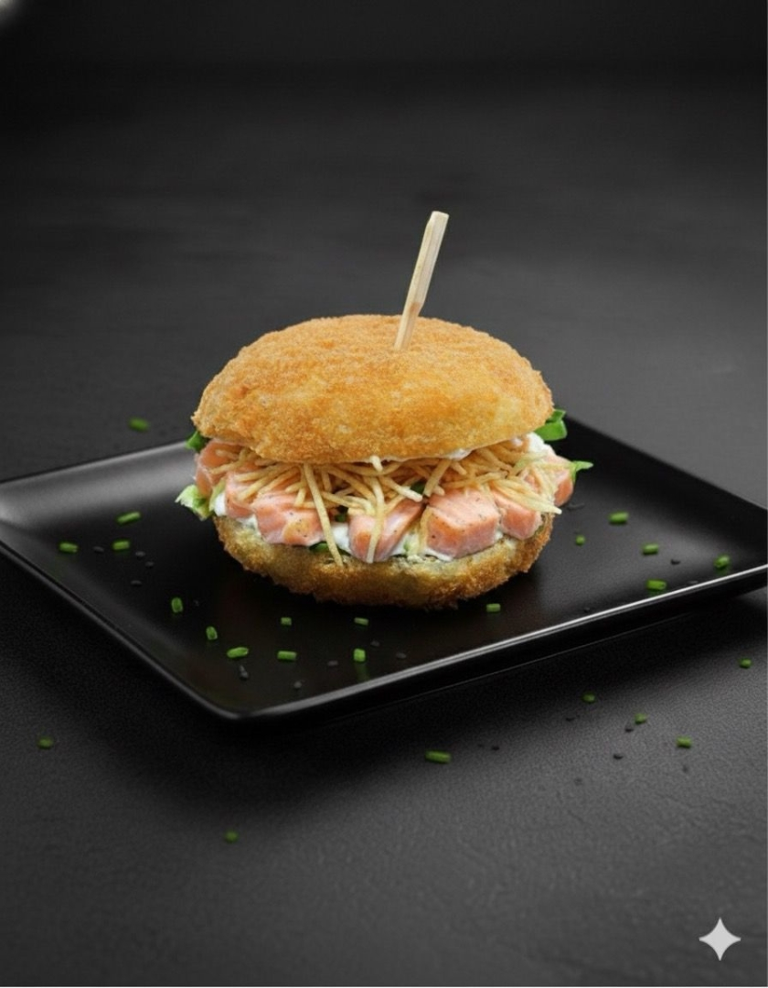 Saboroso sushi burguer, com arroz em forma de pão empanado e frito, com recheio de salmão, camarão empanado, cream cheese com chia e cebolinha.
