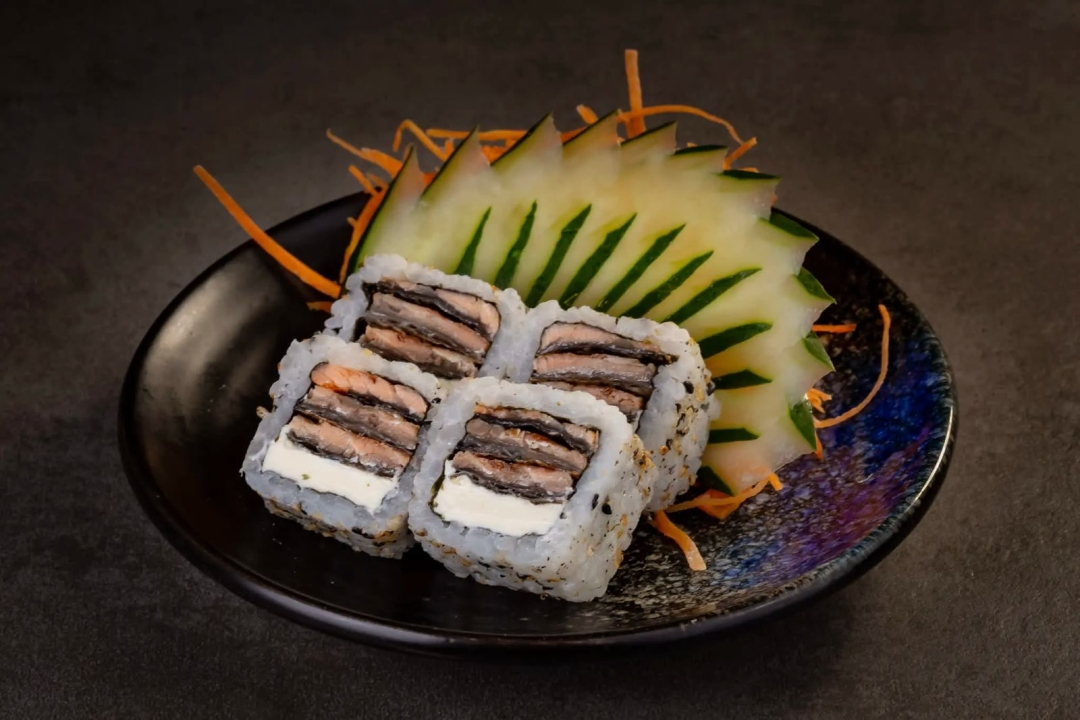 10 unidades de uramaki skin, enrolado com arroz, alga, a pele do salmão grelhada, cream cheese e cebolinha.