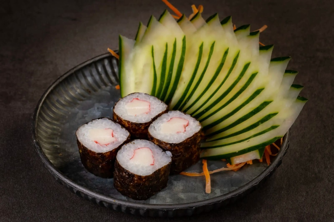 10 unidades de makimono kani kama um enrolado com arroz por dentro, alga, kani kama, cream cheese, gergelim e cebolinha.