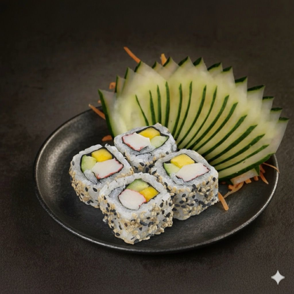 10 Unidade de uramaki california um enrolado com arroz por fora, gergelin, alga, pepino, kani kama e manga.