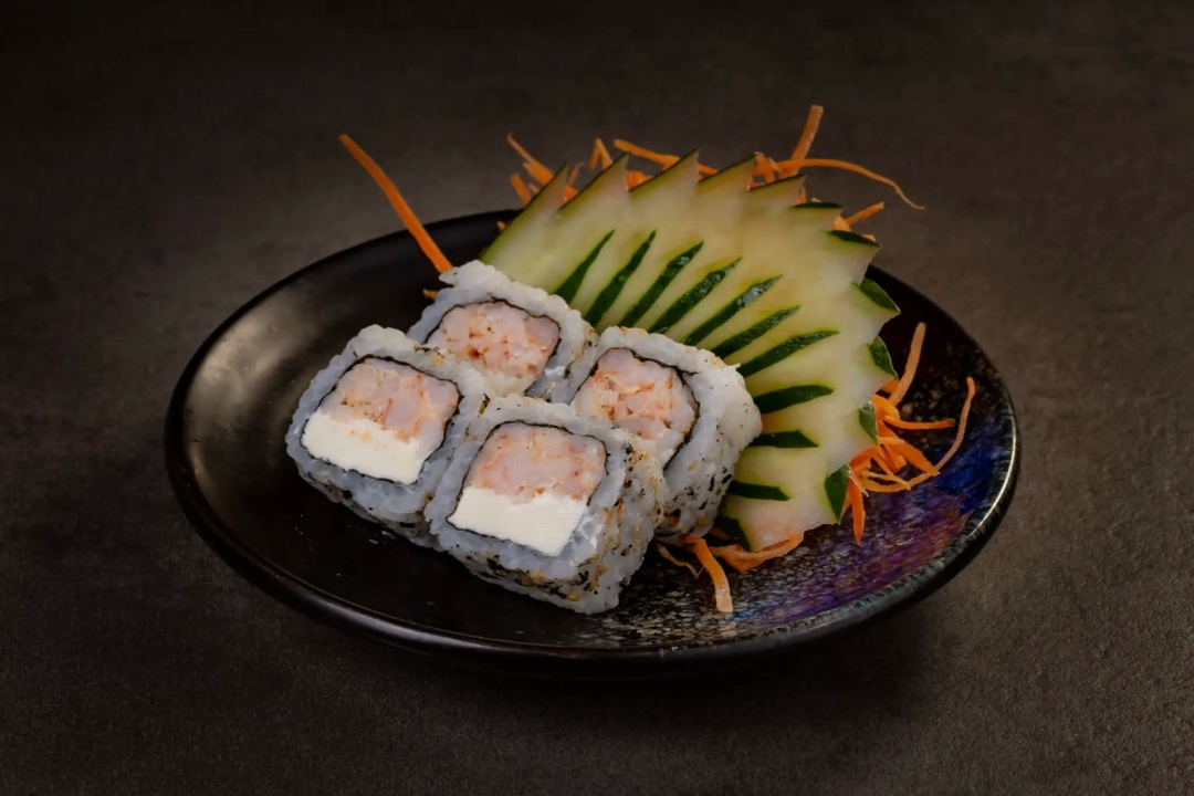 10 Unidades de uramaki de camarão um enrolado com arroz por fora, alga, camarão, cream cheese, gergelim e cebolinha.