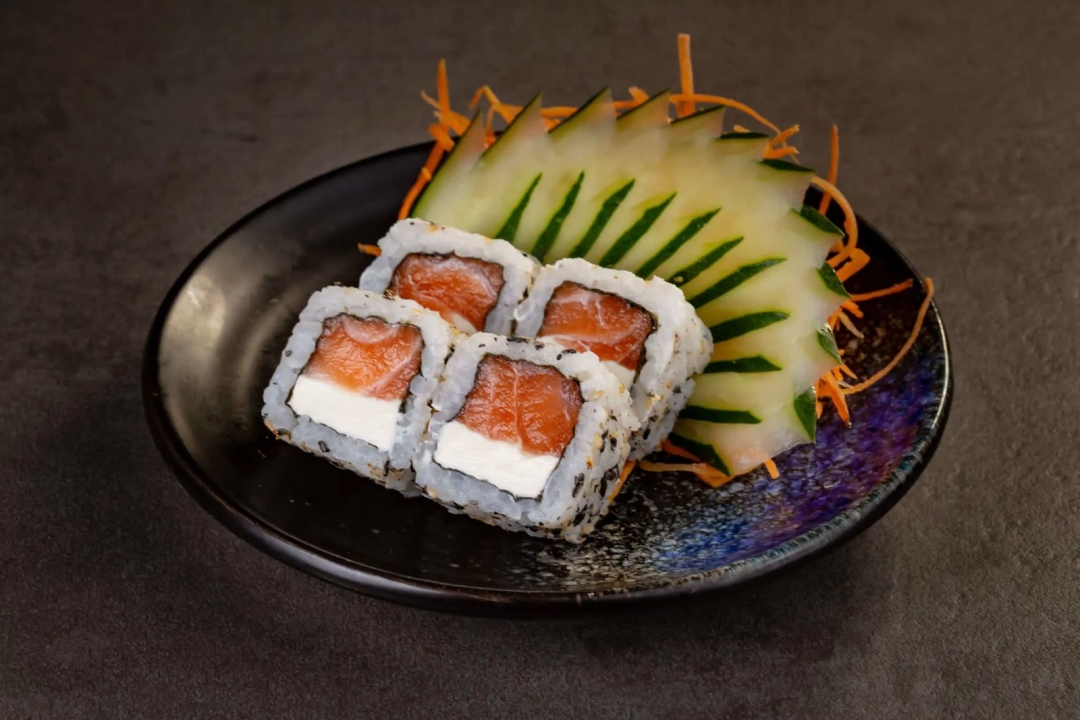 10 Unidades de uramaki de salmão enrolado com arroz por fora, alga, salmão, cream cheese e cebolinha.
