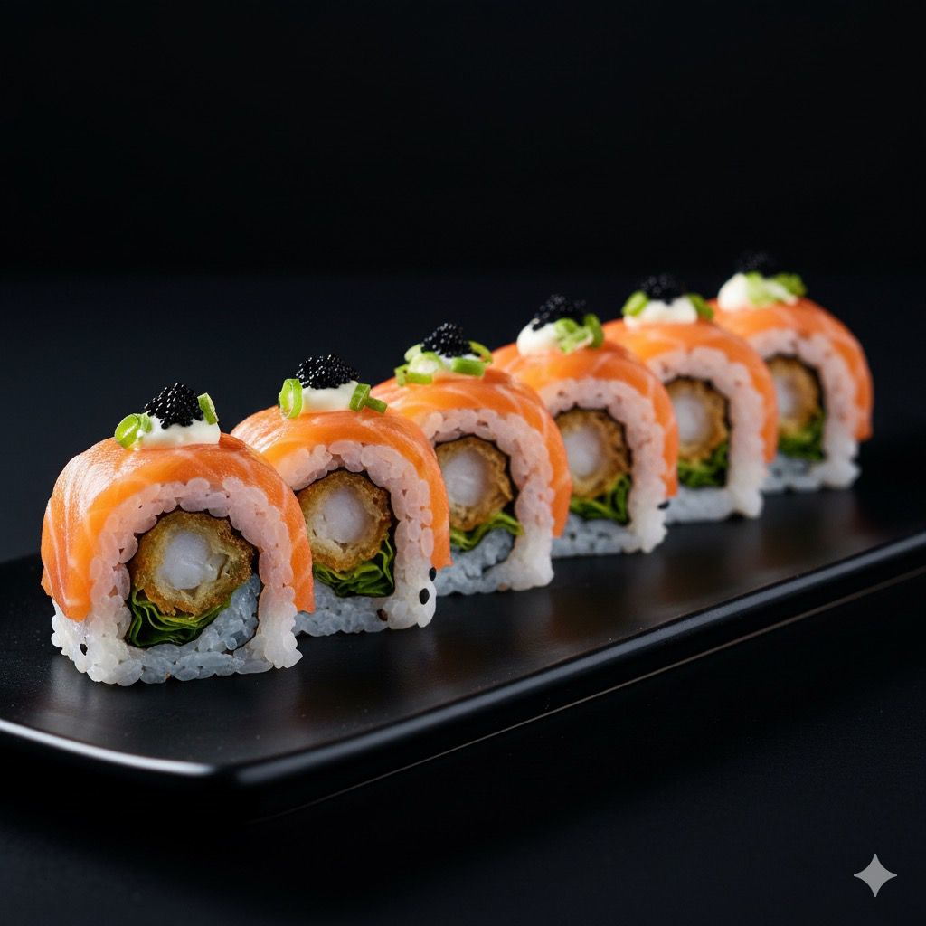 10 Unidades de uramaki enrolado com arroz por fora, alga, camarão, cream cheese, gergelim, cebolinha e laminas de salmão por cima.