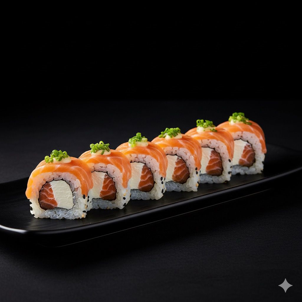 10 Unidades de uramaki um enrolado com arroz por fora, alga, salmão, cream cheese, gergelim, cebolinha e laminas de salmão por cima.