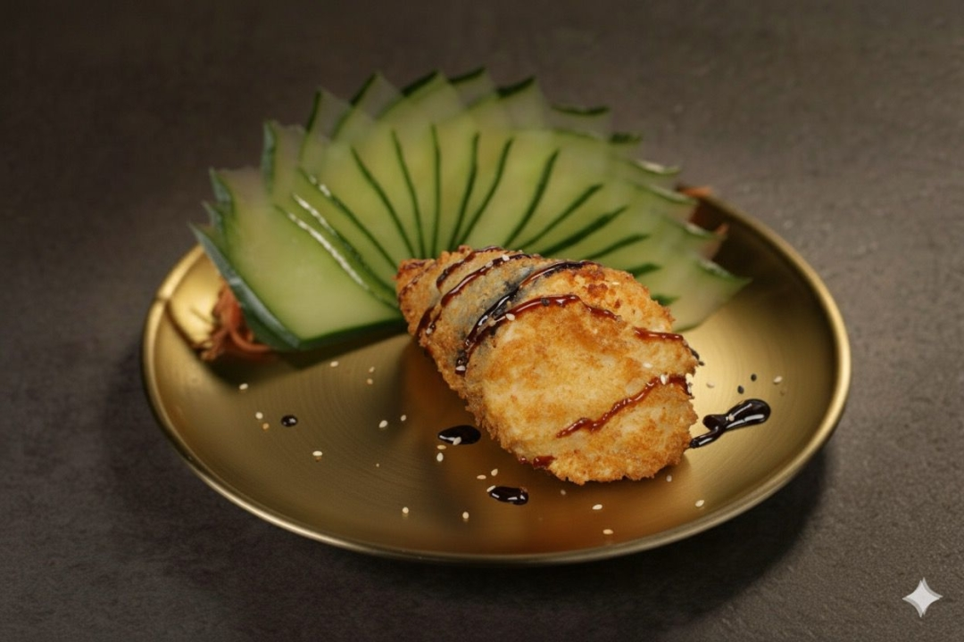 Nori, arroz, salmão, cream cheese, cebolinha, temaki empanado e frito.