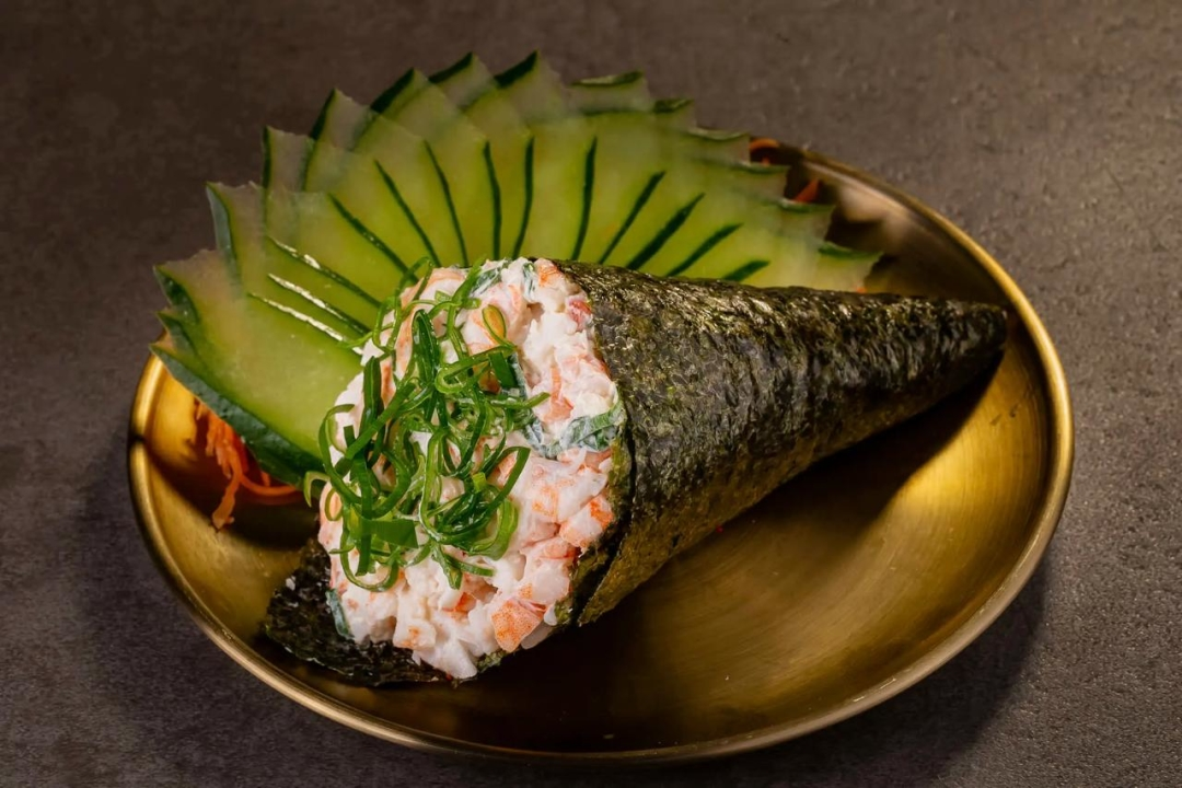 Nori, arroz, salmão com camarão cozido, cream cheese, cebolinha, temaki empanado e frito.
