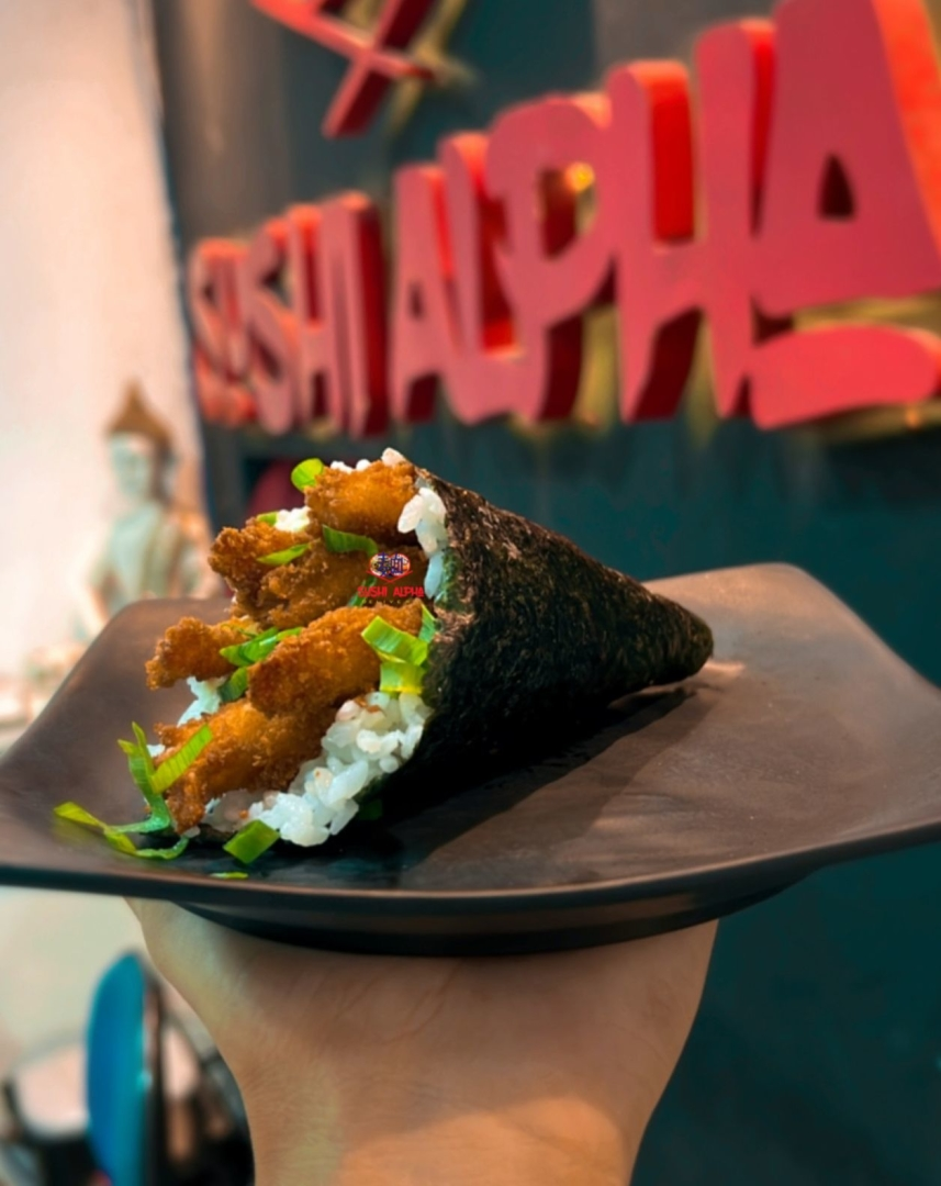 Nori, arroz, cream cheese, salmão grelhado e cebolinha.