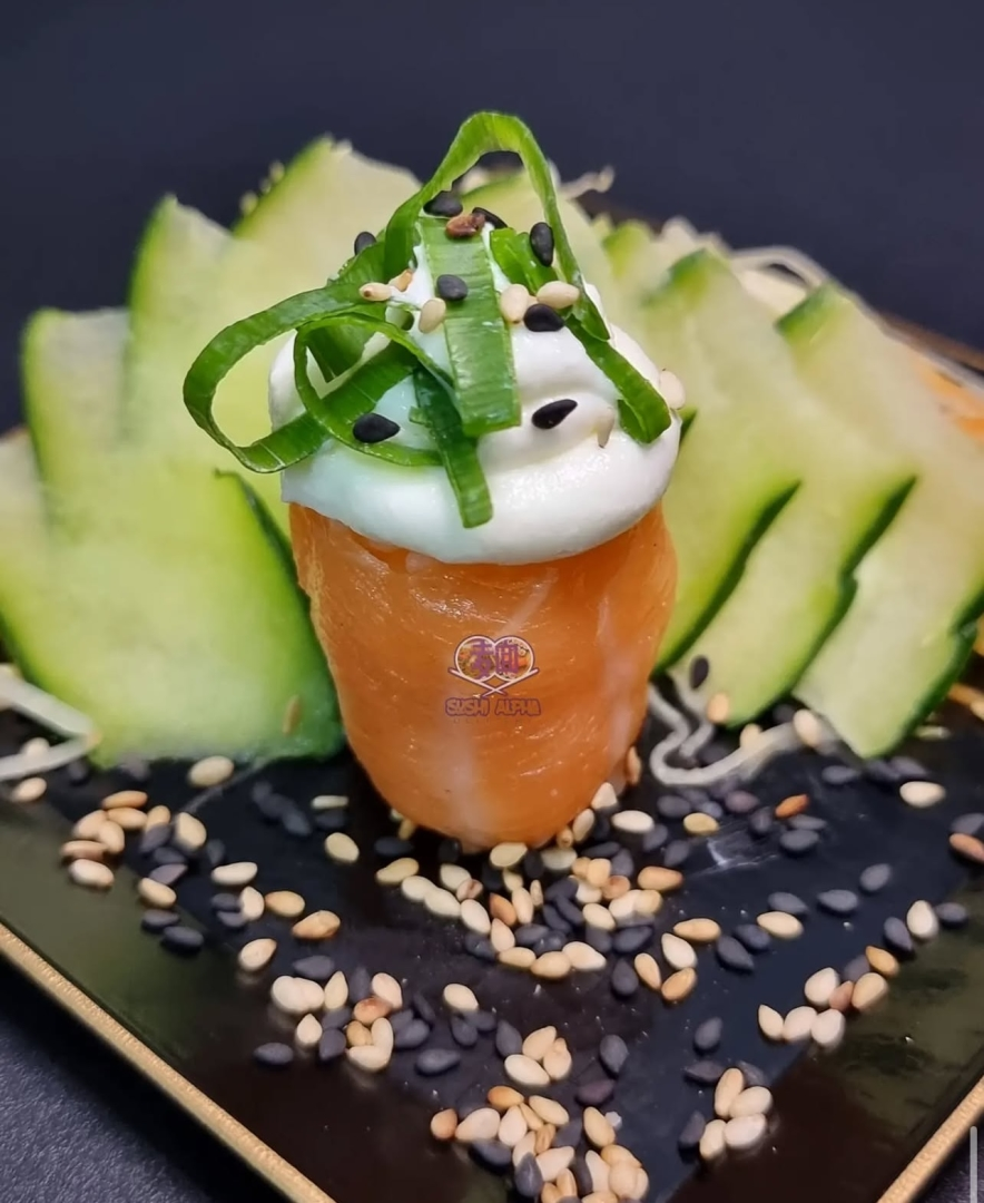 5 Lâminas de salmão, arroz, cream cheese, cebolinha e gergelim.